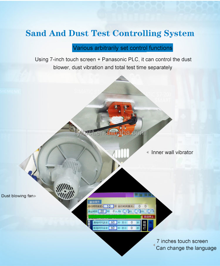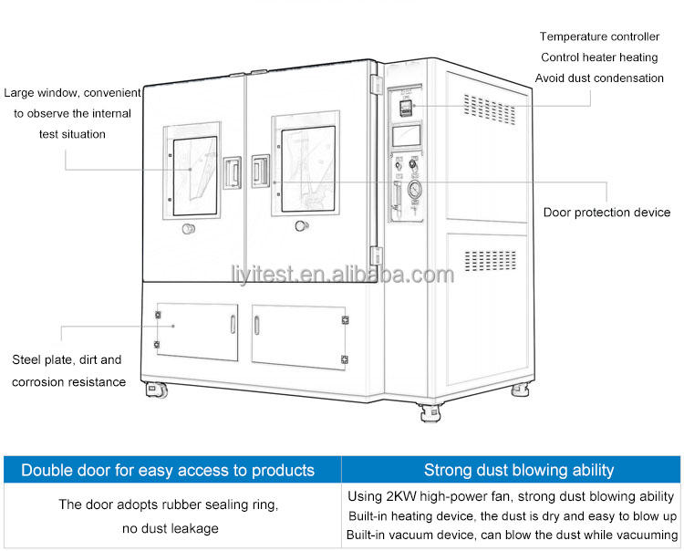 Ο θάλαμος δοκιμών προσομοίωσης άμμου και σκόνης LIYI είναι σχεδιασμένος σύμφωνα με τα πρότυπα GB4706, GB2423, GB7000.1, IEC60529 και πληροί τις απαιτήσεις δοκιμών σκόνης IPX3 και IPX4. Αυτό το όργανο είναι ιδανικό για τη δοκιμή ντουλαπιών ελέγχου, οικιακών συσκευών, ηλεκτρικών συσκευών χαμηλής τάσης, αυτοκινήτων, λαμπτήρων και φανών, εξαρτημάτων μοτοσικλετών και άλλων εξωτερικών κελυφών. Ο θάλαμος διατηρεί σταθερή ή μεταβλητή πίεση και είναι κατάλληλος για δοκιμές ρύπανσης σκόνης χαμηλής συγκέντρωσης σε εσωτερικούς χώρους.